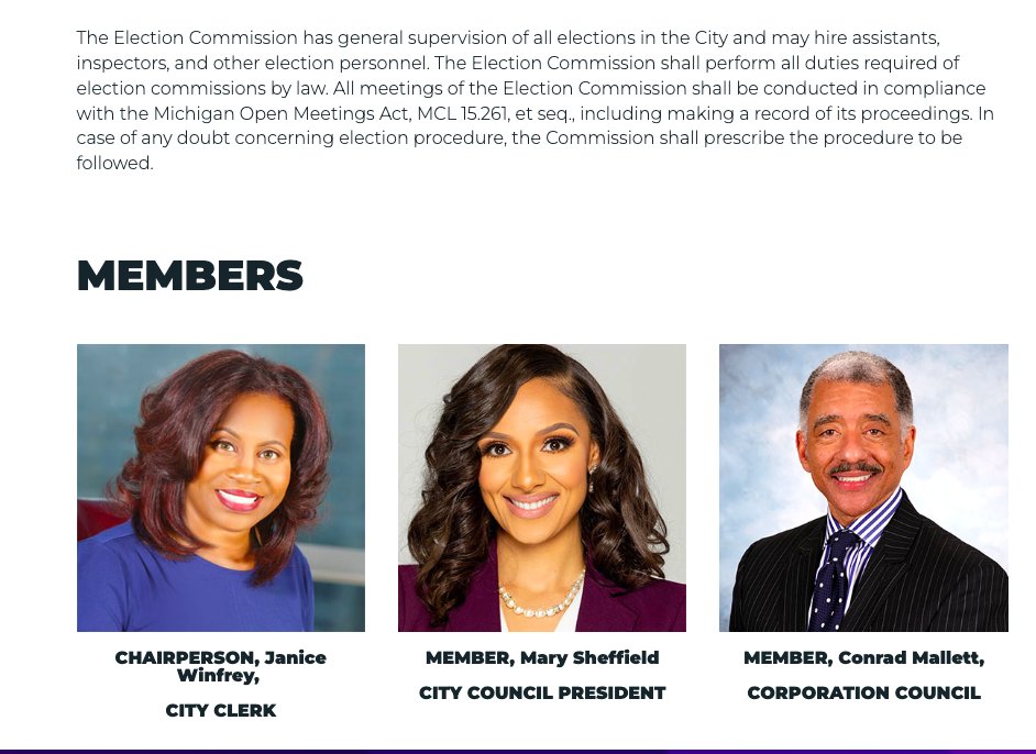 The Election Commission serves as the governing body for the Elections Department and is responsible for supervision of all elections in Detroit.