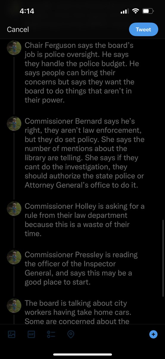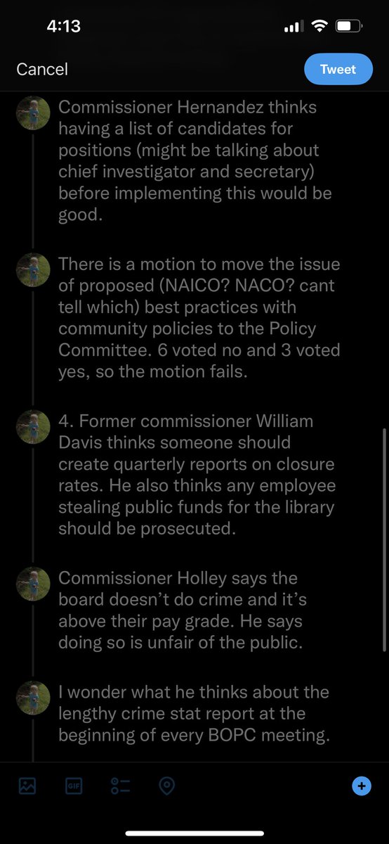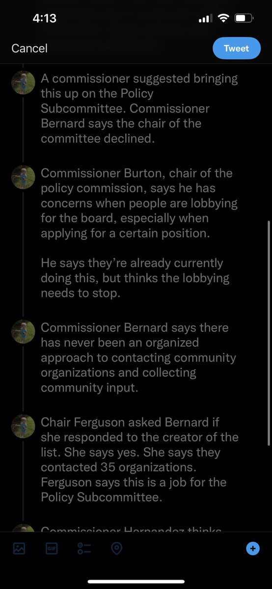 Commissioner Bernard is asking about the community outreach. She says people giving input to the department applying for a job should not be disqualified for the job. I think she mentioned discrimination.