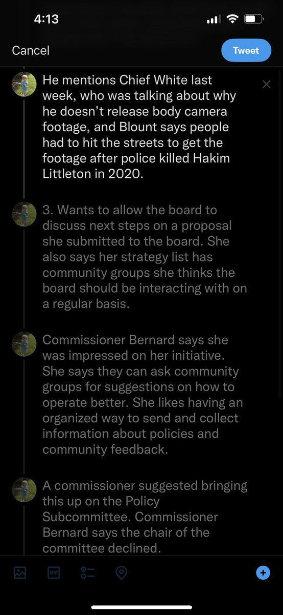 He mentions Chief White last week, who was talking about why he doesn’t release body camera footage, and Blount says people had to hit the streets to get the footage after police killed Hakim Littleton in 2020.