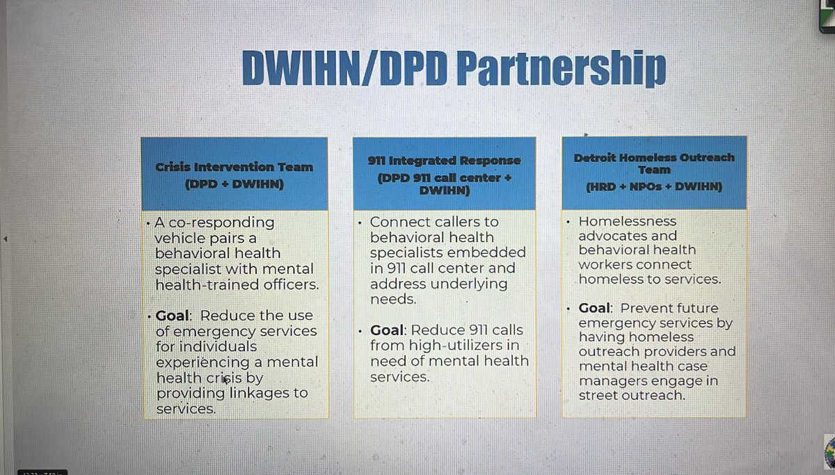This slide mentions the co-response team. DPD is partnering with DWIHN for this.
