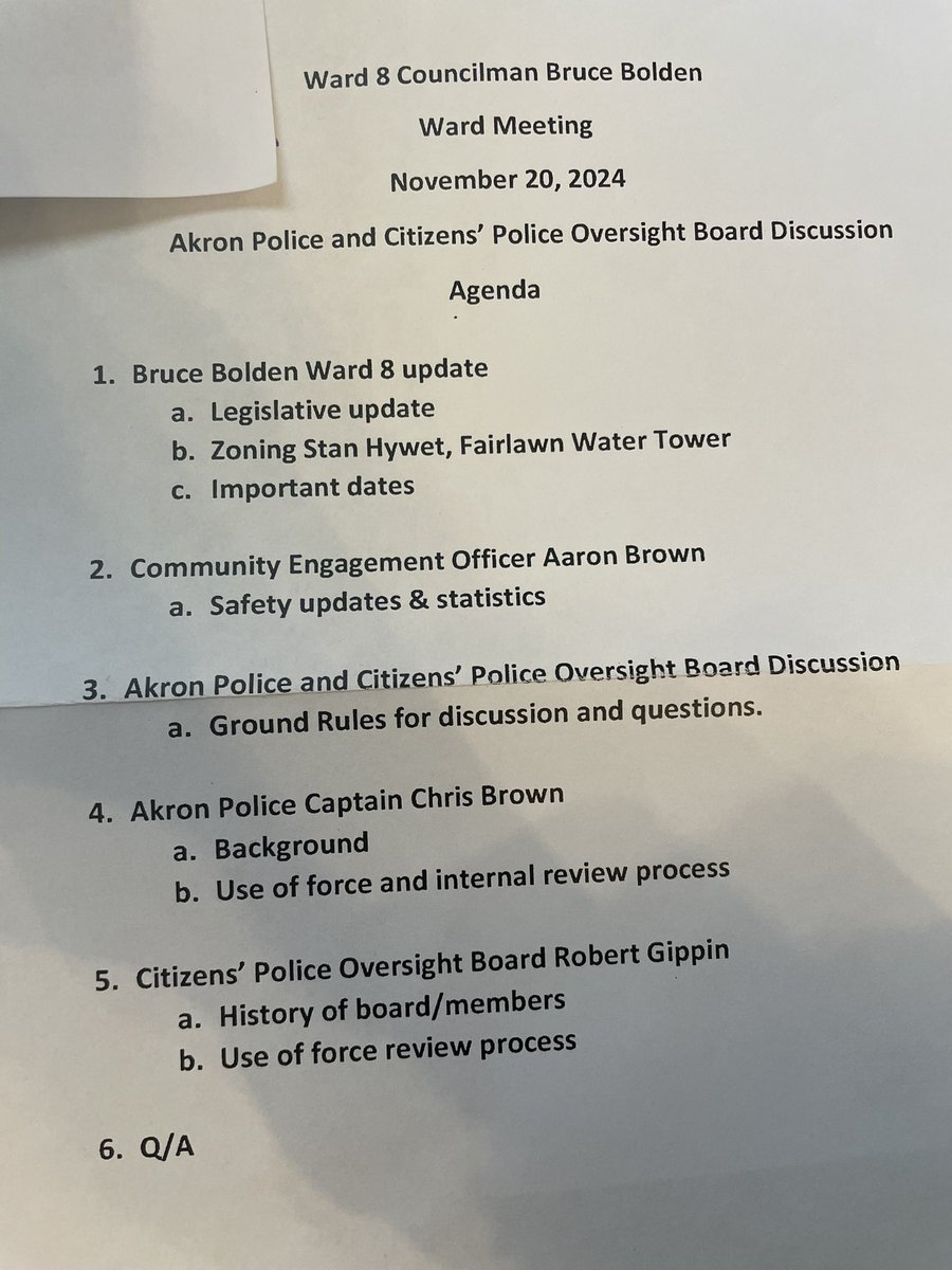 Hi readers, I covered the Akron City Council Ward 8 meeting on Wednesday, Nov. 20 for #AkronDocumenters @SignalAkron. Councilman Bruce Bolden started the meeting around 6:09pm. There were about 30 guests attending and a handful of Akron police officers there.