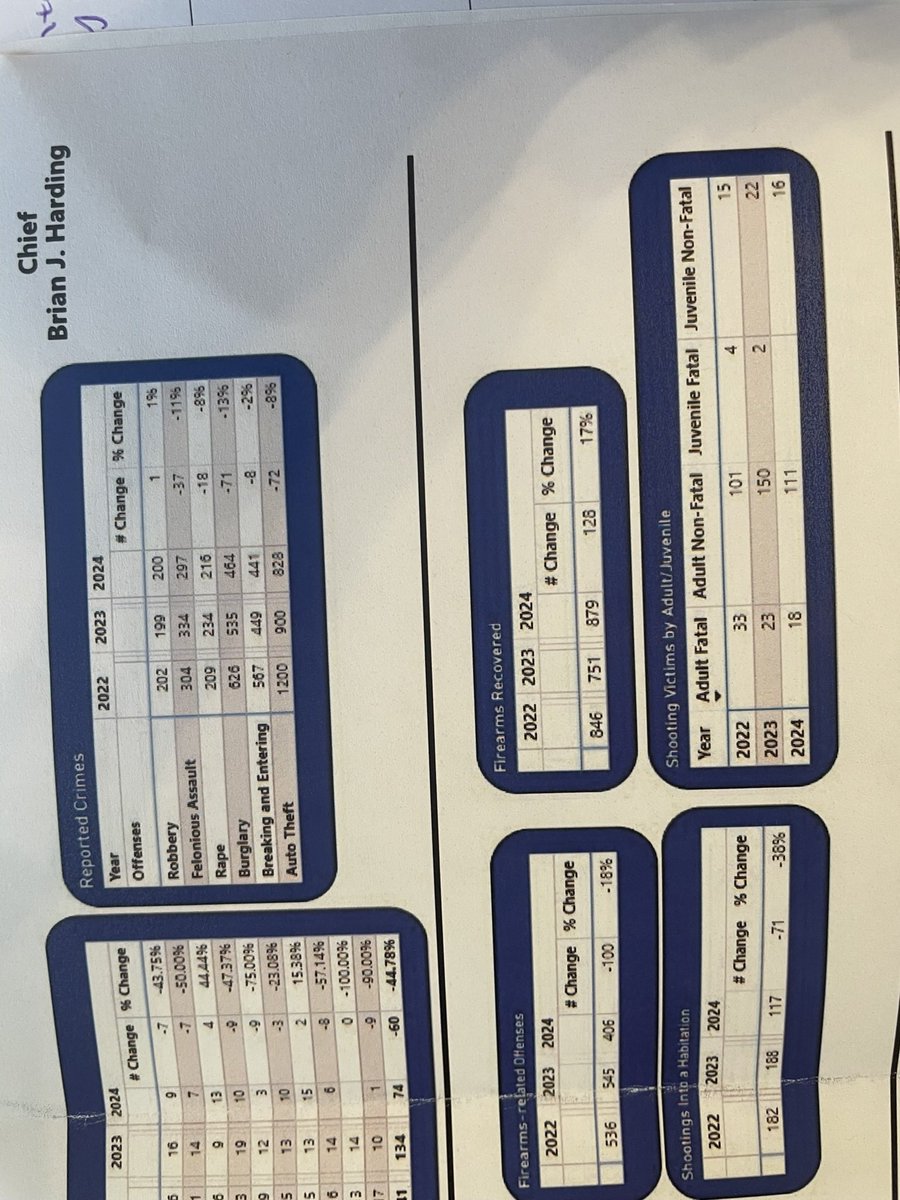 With auto theft being the most frequent crime, Brown reminded everyone to take valuables out of their cars and lock the doors. According to the crime report, there have been 828 auto thefts this year with the number going down each year since 2022.